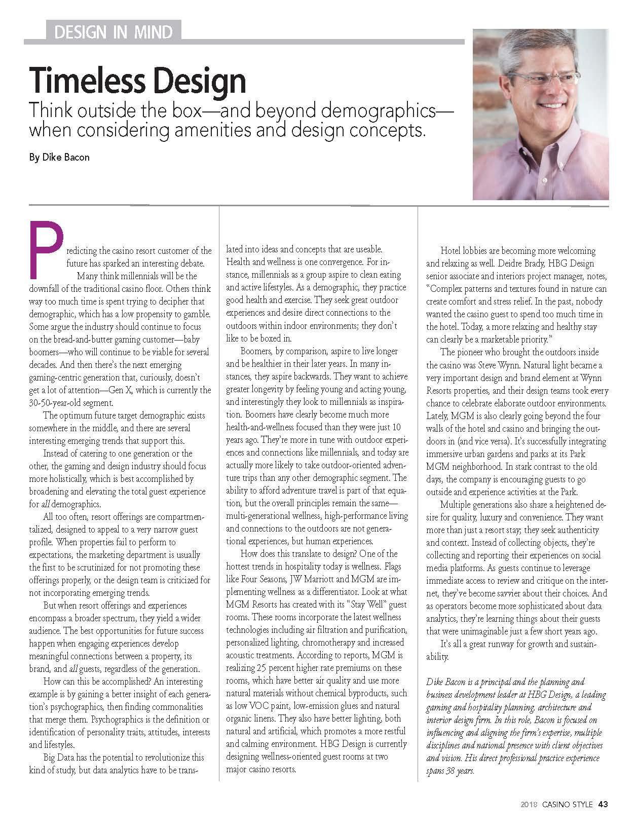 “Instead of catering to one generation or the other, the gaming and design industry should focus more holistically, which is best accomplished by broadening and elevating the total guest experience for all demographics.” – Dike Bacon, as featured in the latest Global Gaming Business, Casino Style magazine.