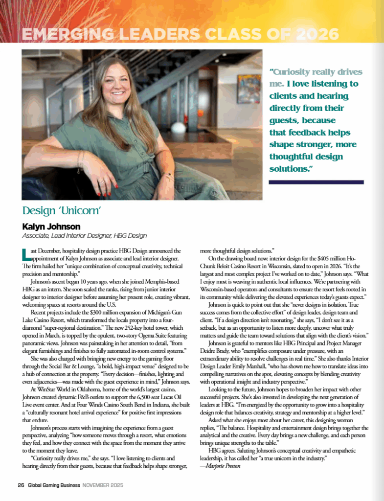 HBG Design proudly celebrates Kalyn Johnson, Associate and Lead Interior Designer, for being named to the 2026 Emerging Leaders of Gaming 40 Under 40, an honor recognizing the industry’s brightest rising talent shaping the future of gaming and hospitality.